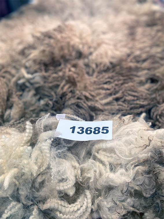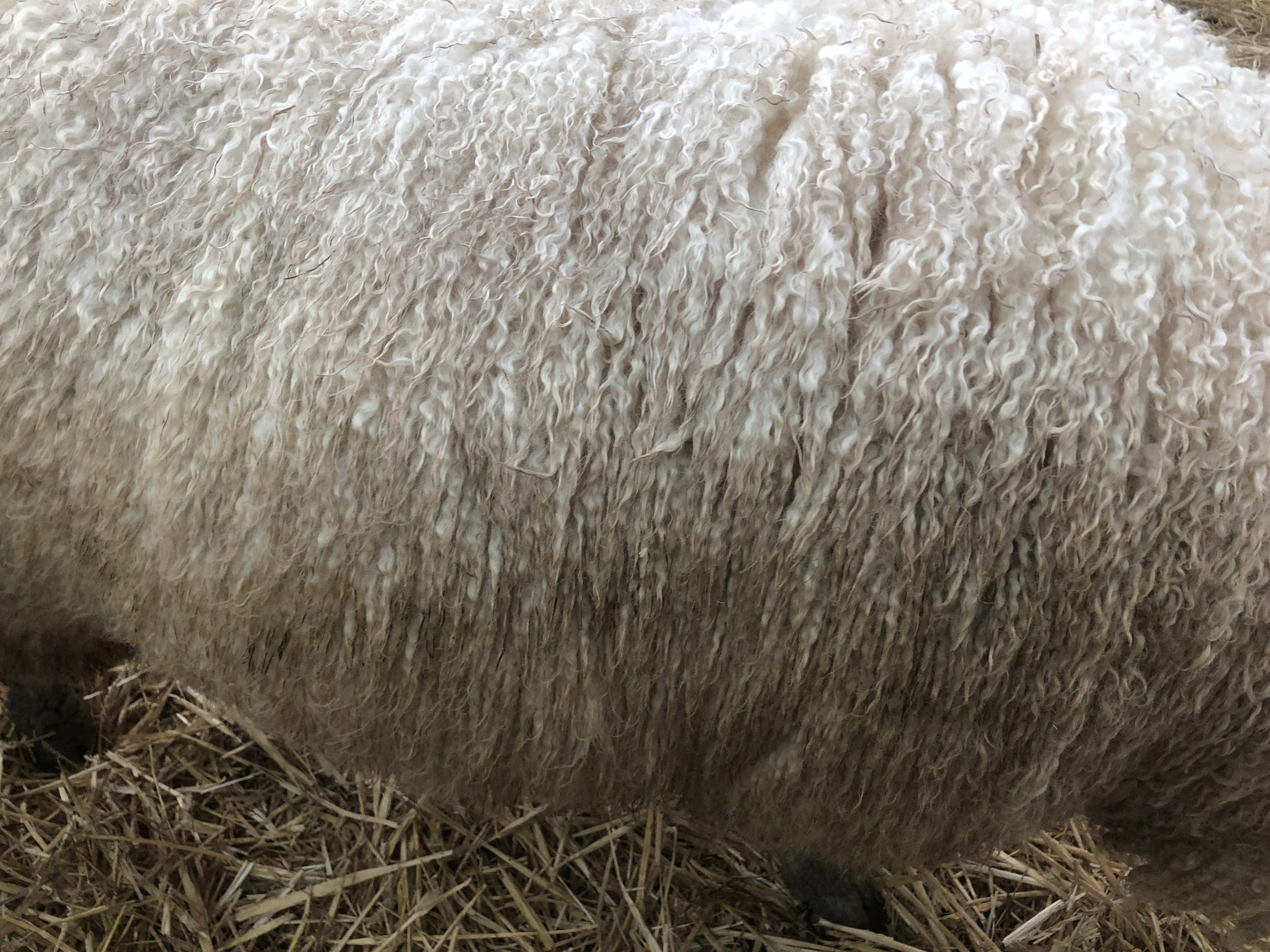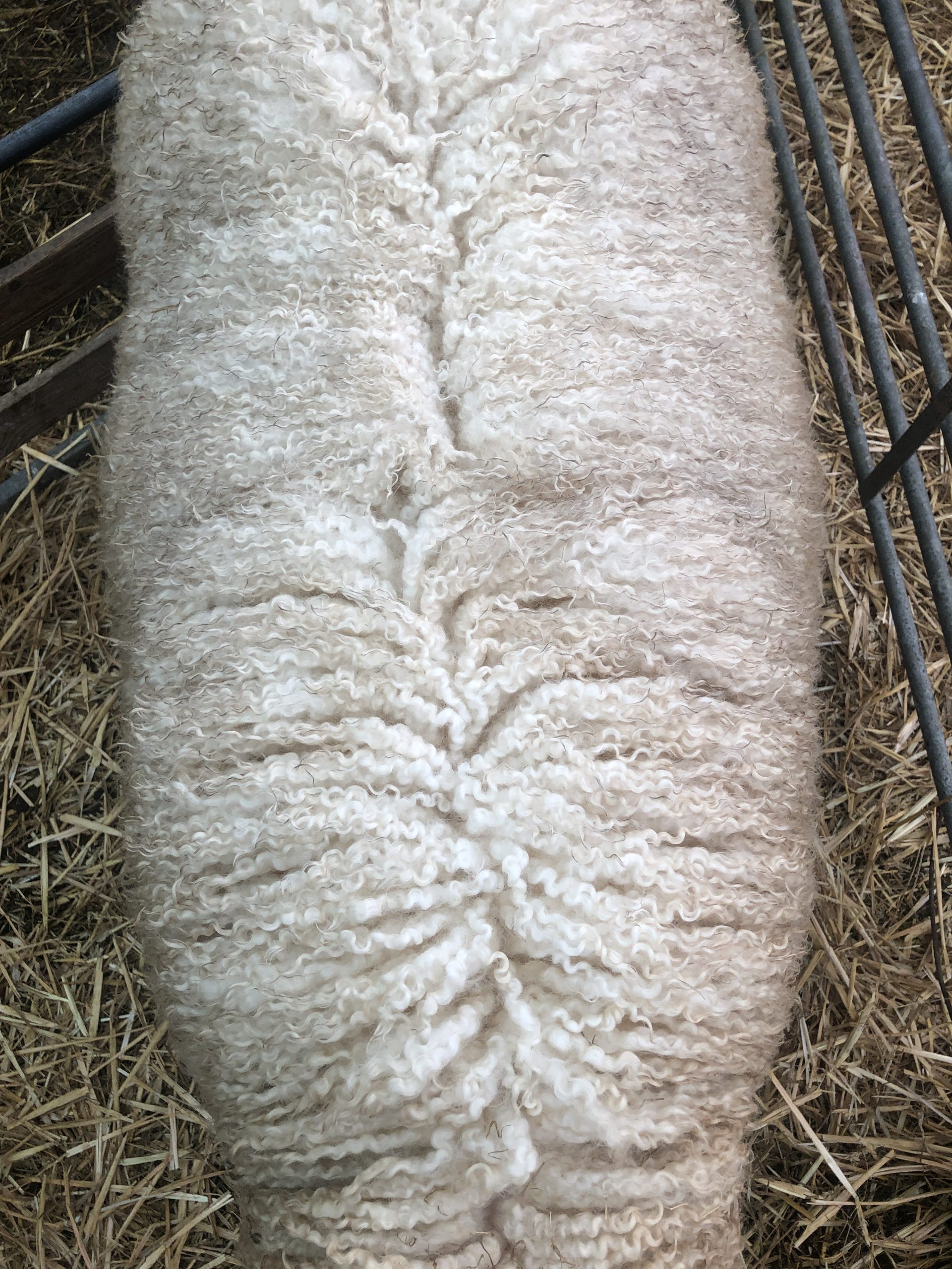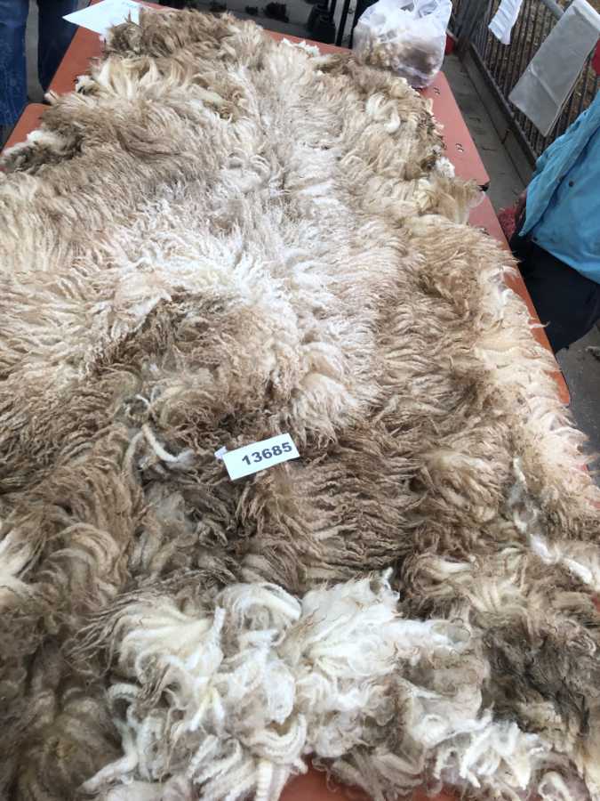 Deze vacht is niet machinaal geschoren maar geknipt. Dat betekent dat er geen “dubbelscheer” in de vacht zit (kleine korte stukjes). Na het scheren zijn evt vuile stukken verwijderd, evenals stro en hooi. De vacht is niet gewassen en is geschoond zoals je hem op de rechter foto’s ziet.