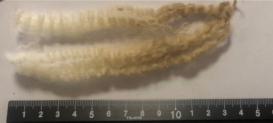 De vezellengte is zo’n 14 cm, er kunnen langere lokken tussen zitten.