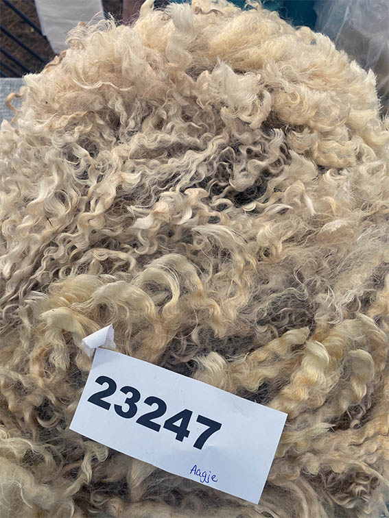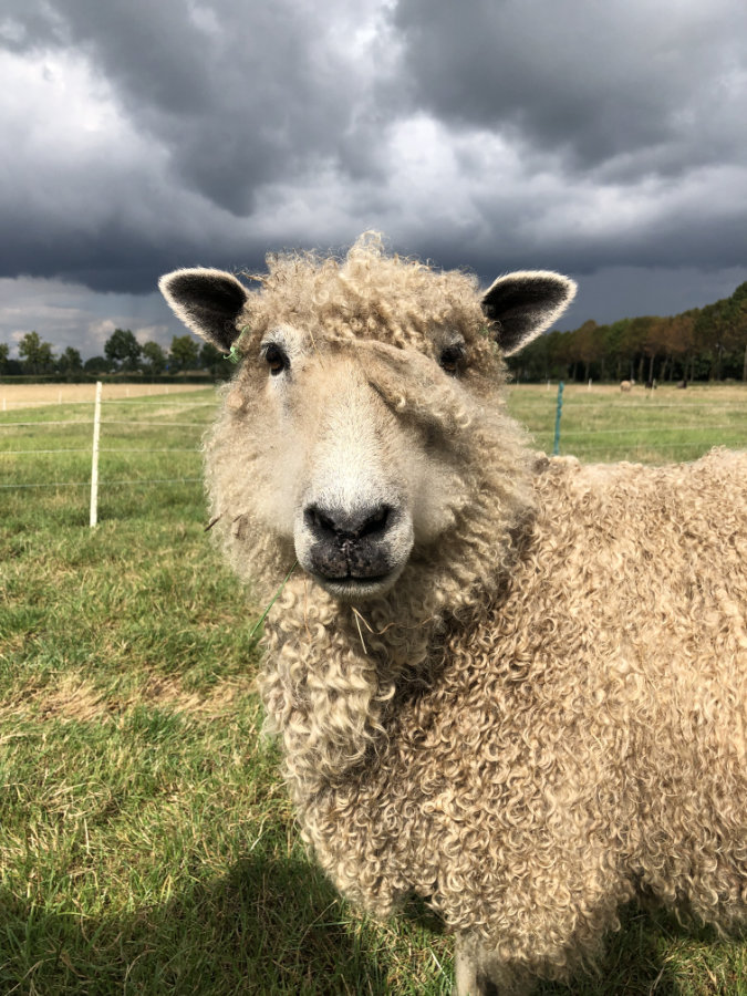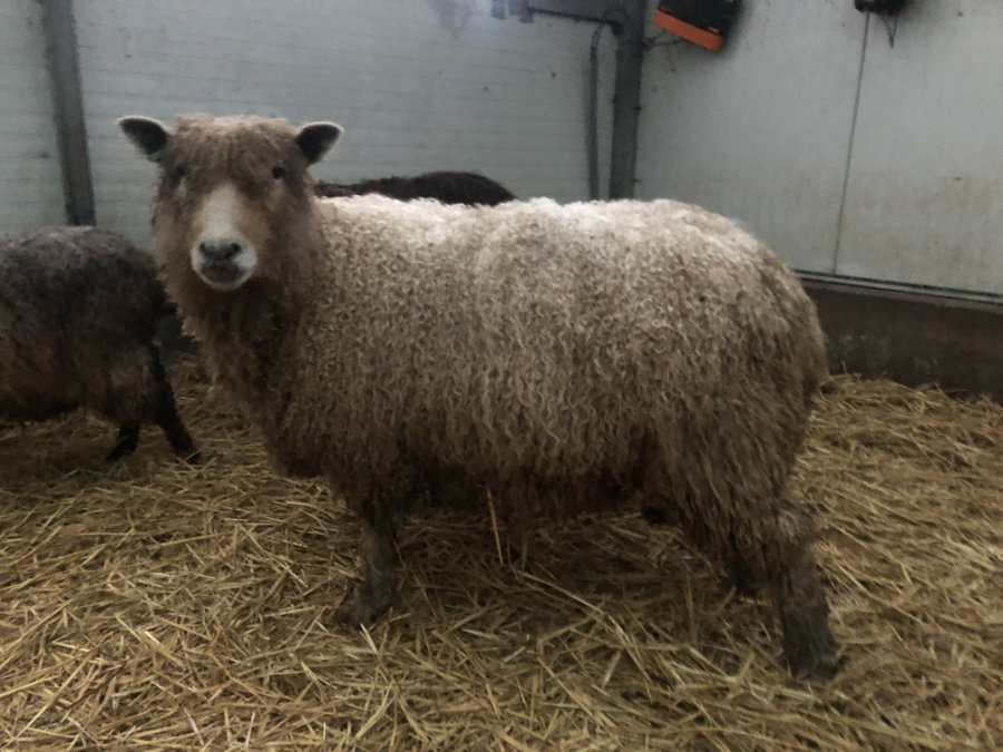 Aagje is een grote witte ooi met het uiterlijk van een wensleydale. Haar moeder is Eitje, onze enorme Wensleydale x Leicester ooi, daar heeft Aagje haar mooie glanzende witte lokken van geeerfd.