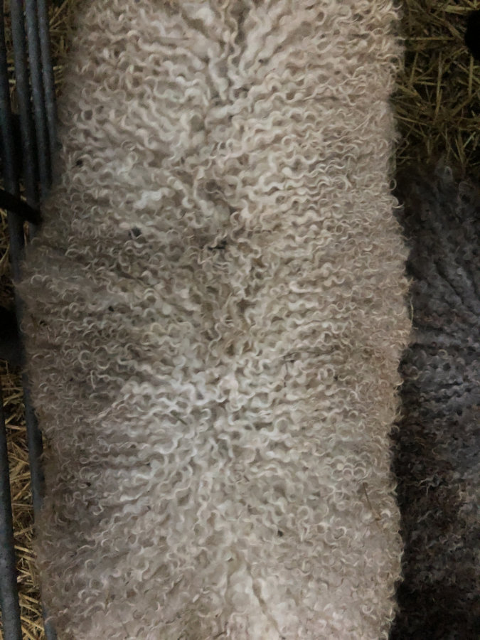 Deze vacht is niet machinaal geschoren maar geknipt. Dat betekent dat er geen “dubbelscheer” in de vacht zit (kleine korte stukjes). Na het scheren zijn evt vuile stukken verwijderd, evenals stro en hooi. De vacht is niet gewassen en is geschoond zoals je hem op de rechter foto’s ziet.