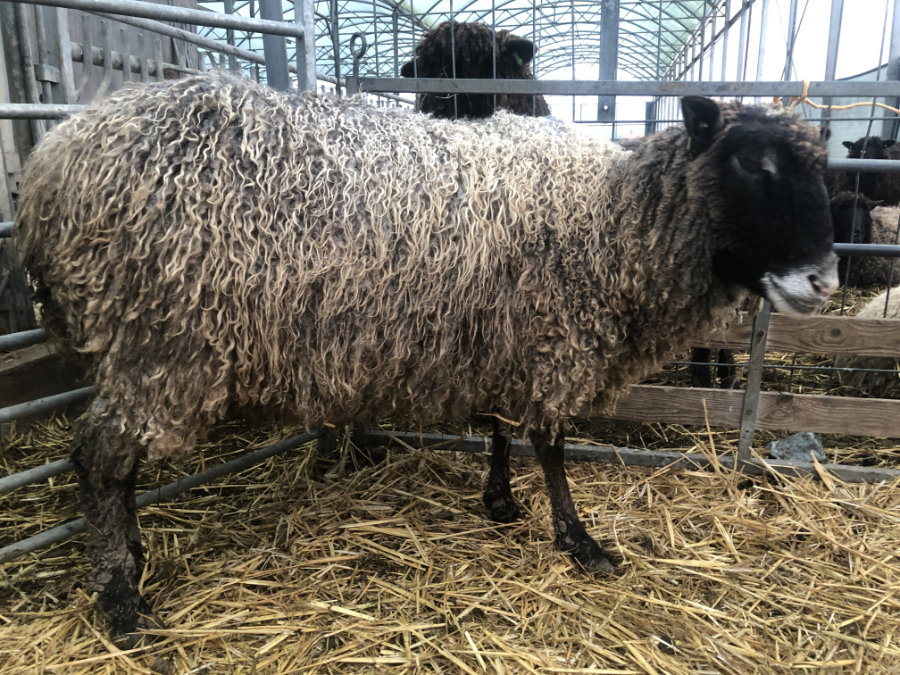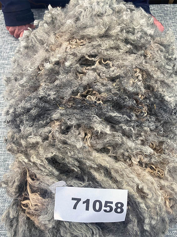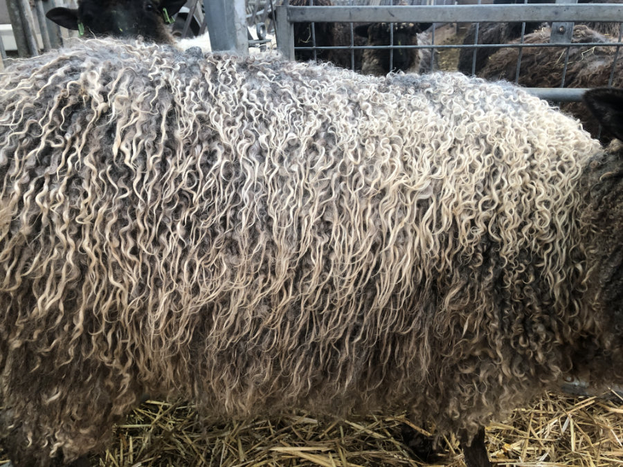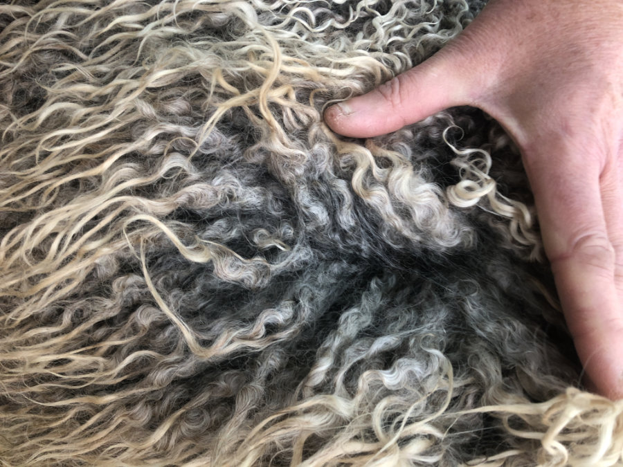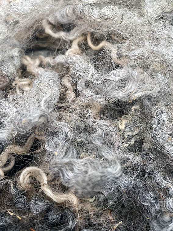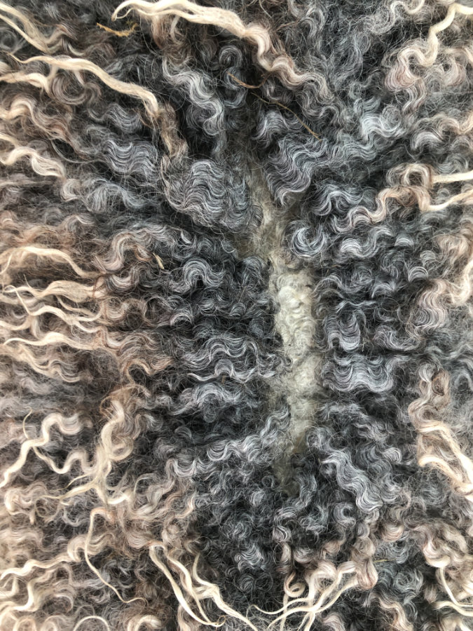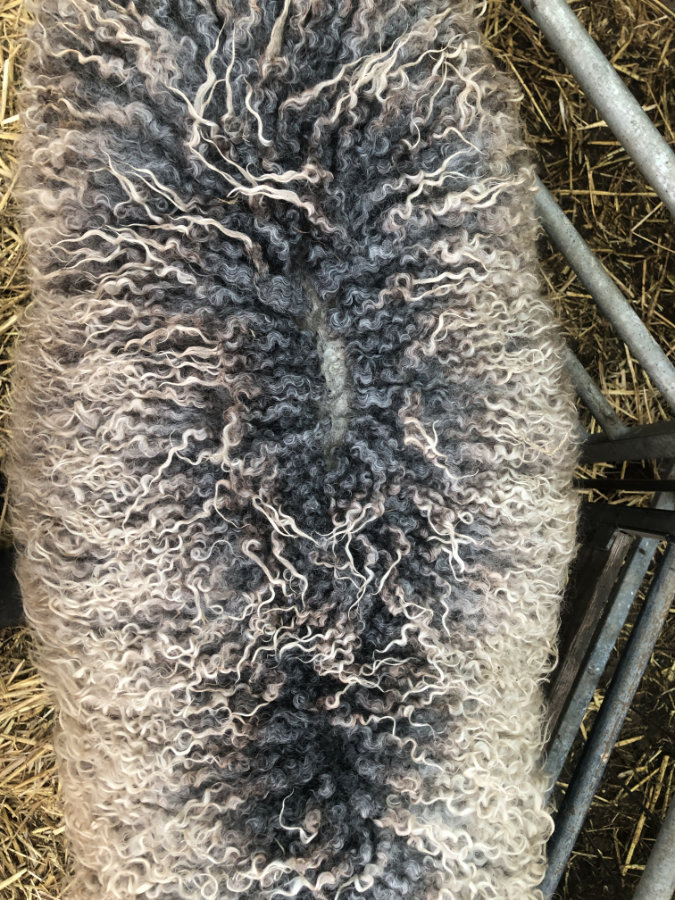 Deze mooi gekleurde licht blauw-grijze vacht met sterke krul is een geschikte viltvacht. De krullen zijn ook los te gebruiken in projecten.