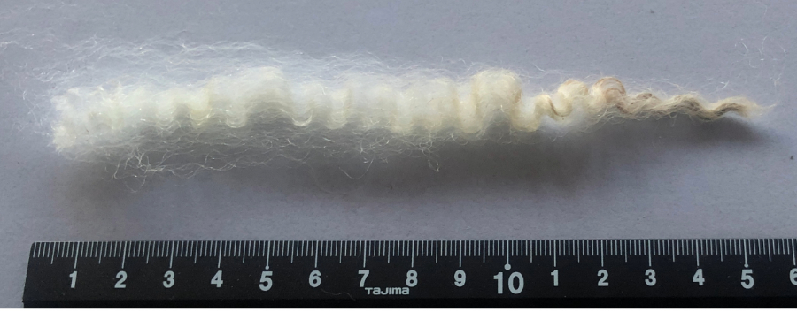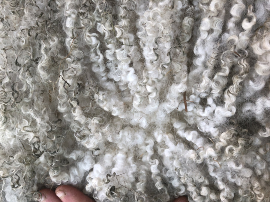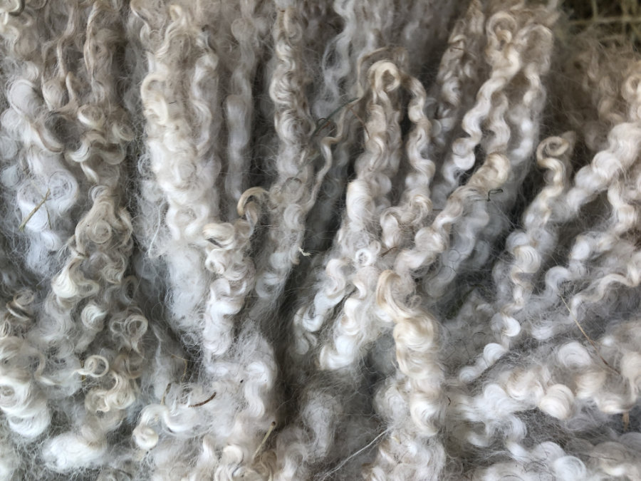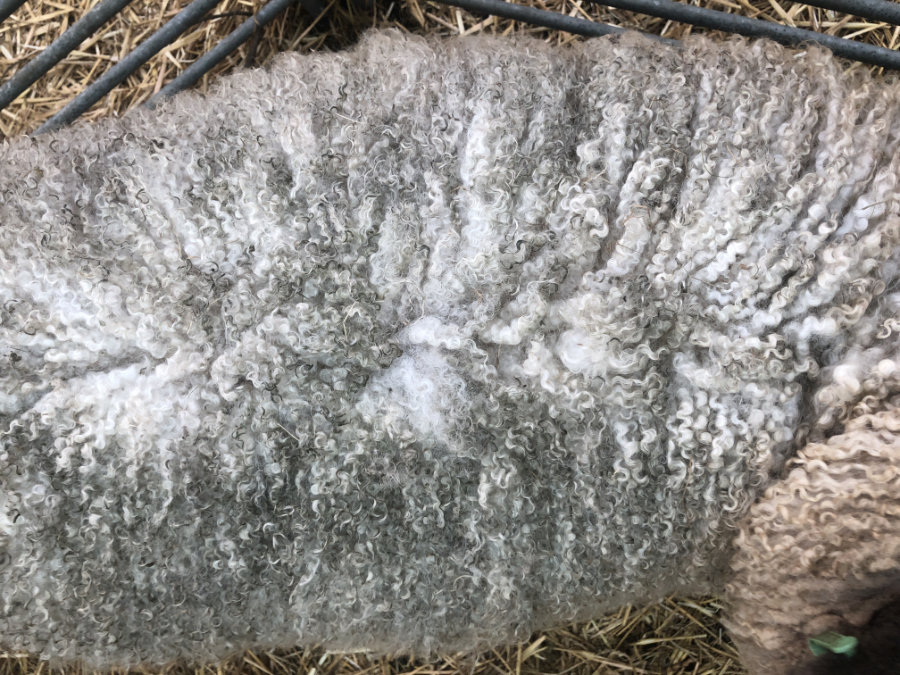 Deze mooie bijna witte vacht (iets lichtgrijs) is geschikt om te spinnen. Als je hem kamt krijg je prachtig glanzend kamgaren. Vilten kan echter ook. De lange lokken hebben een mooie watergolf.
