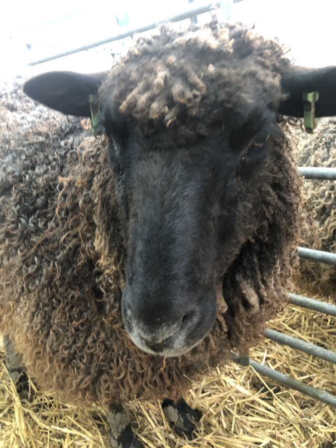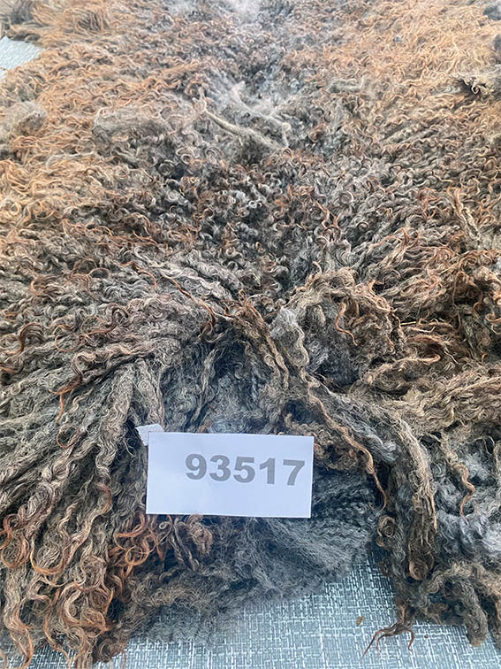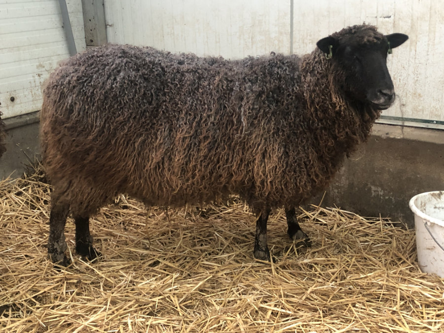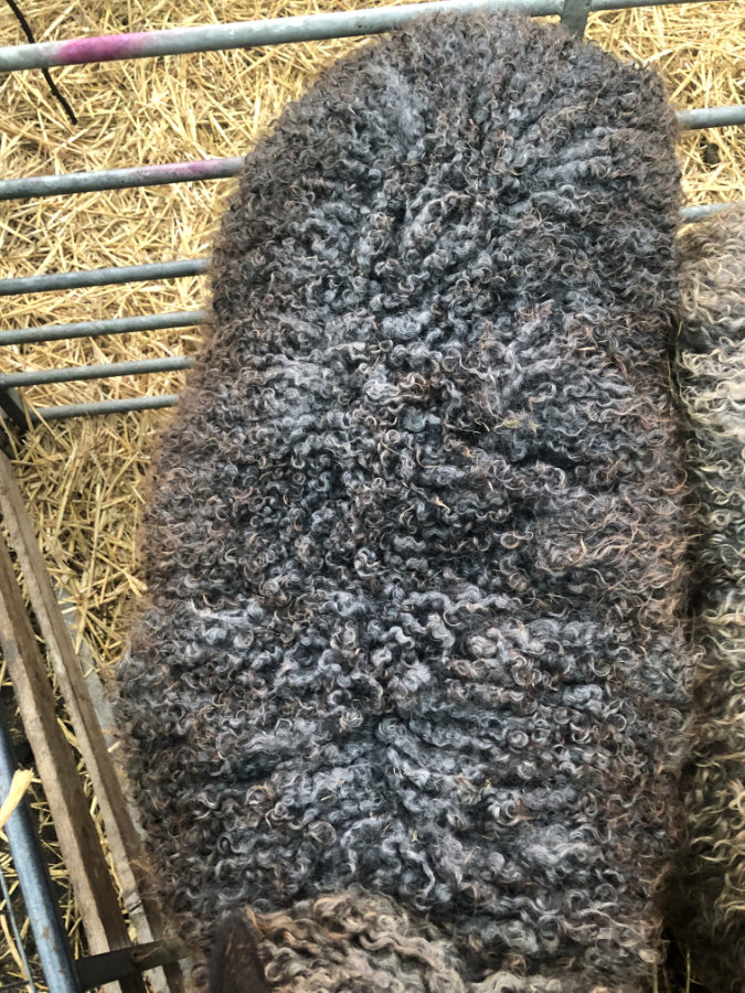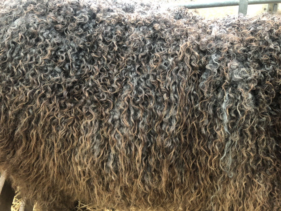 Deze knappe dame heeft prachtige krulletjes. De kleurnuance van haar vacht is ook geweldig, blauwgrijs met warmbruin. Je kunt er alles mee, vilten of spinnen.