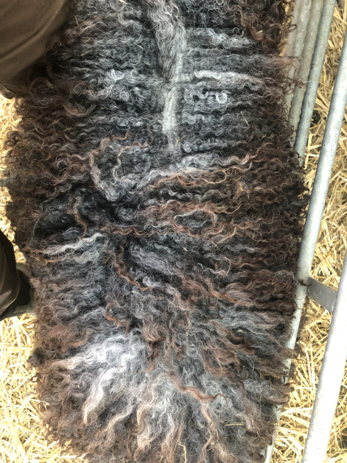 Deze vacht is niet machinaal geschoren maar geknipt. Dat betekent dat er geen “dubbelscheer” in de vacht zit (kleine korte stukjes). Na het scheren zijn evt vuile stukken verwijderd, evenals stro en hooi. De vacht is niet gewassen en is geschoond zoals je hem op de rechter foto’s ziet.