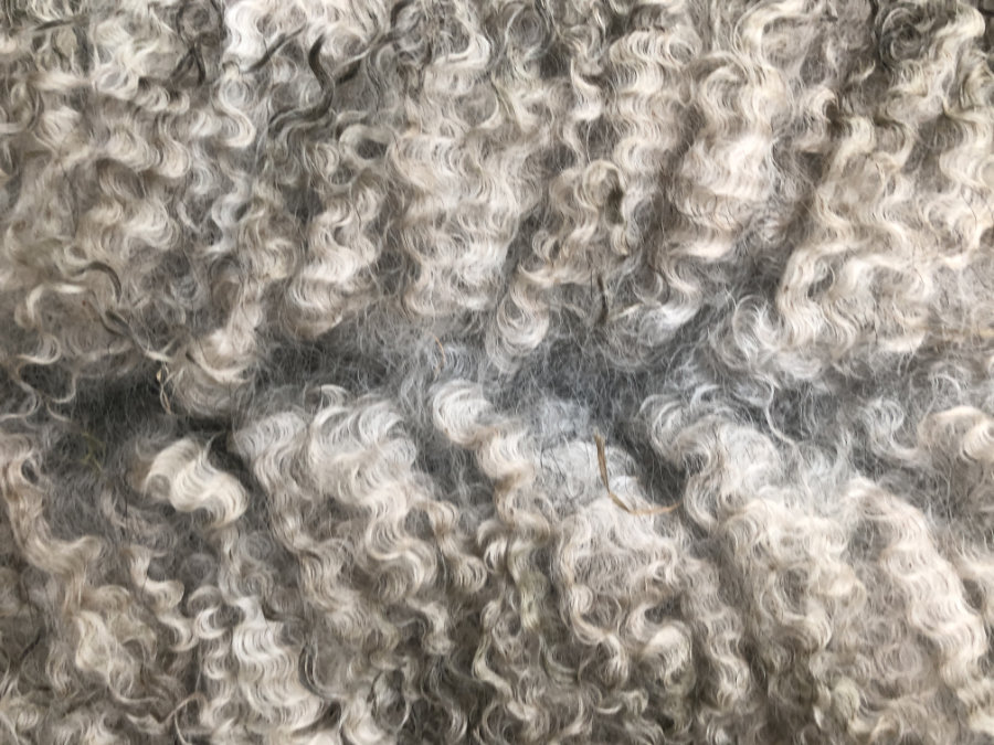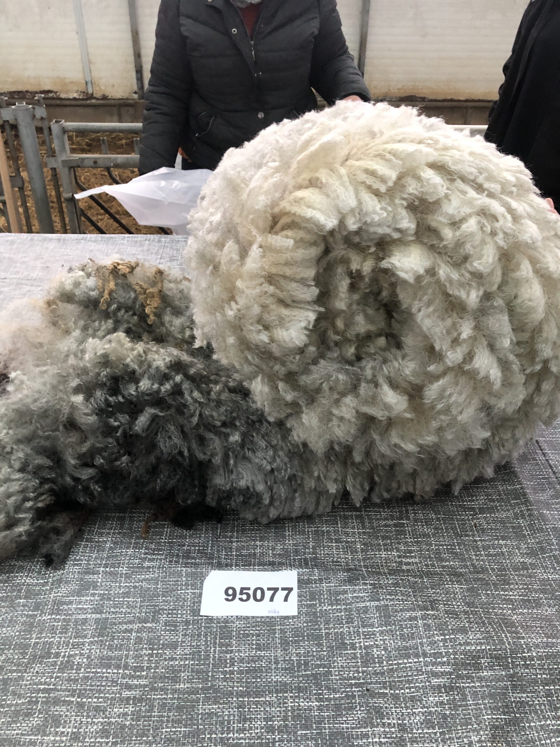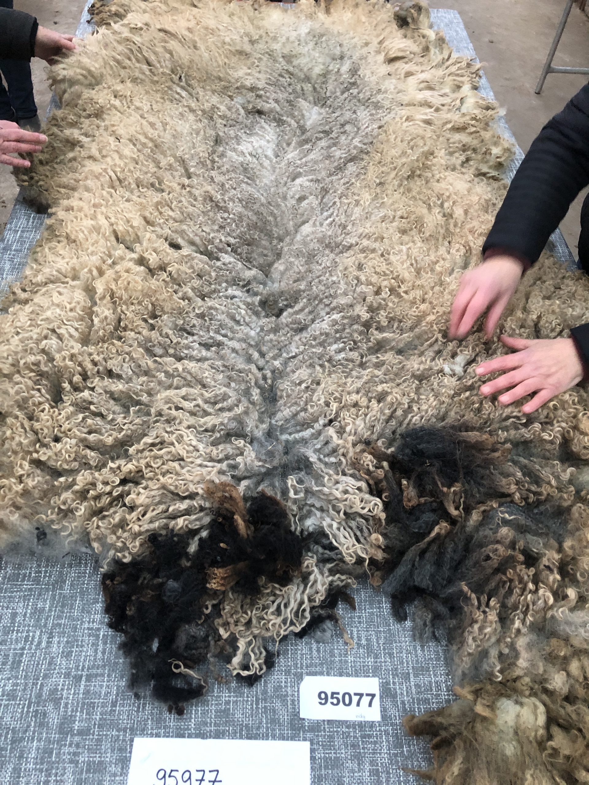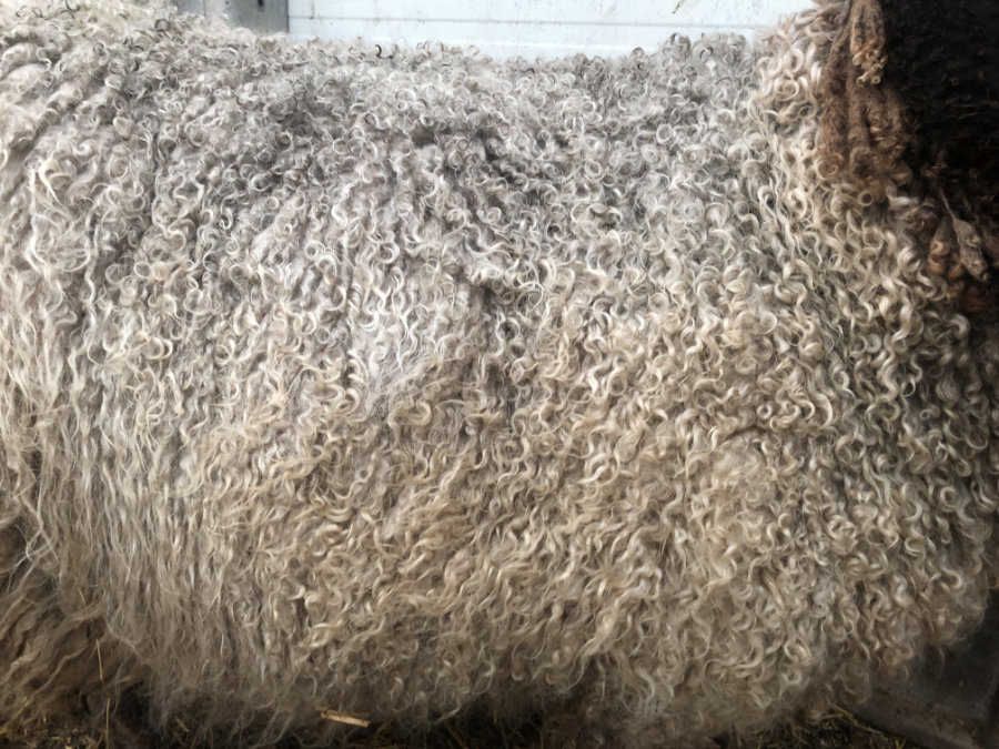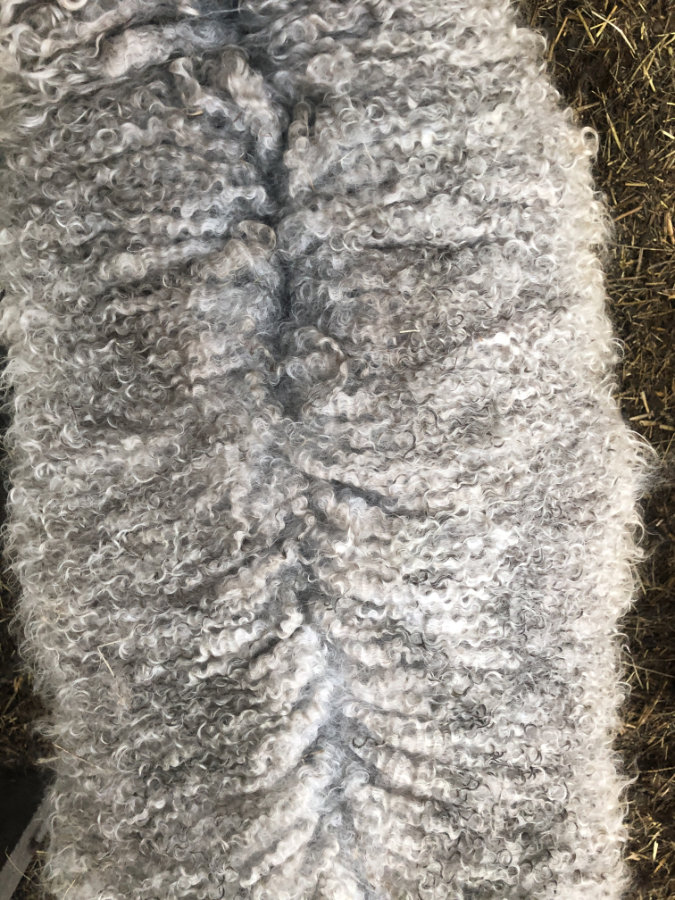 Deze vacht is niet machinaal geschoren maar geknipt. Dat betekent dat er geen “dubbelscheer” in de vacht zit (kleine korte stukjes). Na het scheren zijn evt vuile stukken verwijderd, evenals stro en hooi. De vacht is niet gewassen en is geschoond zoals je hem op de rechter foto’s ziet.