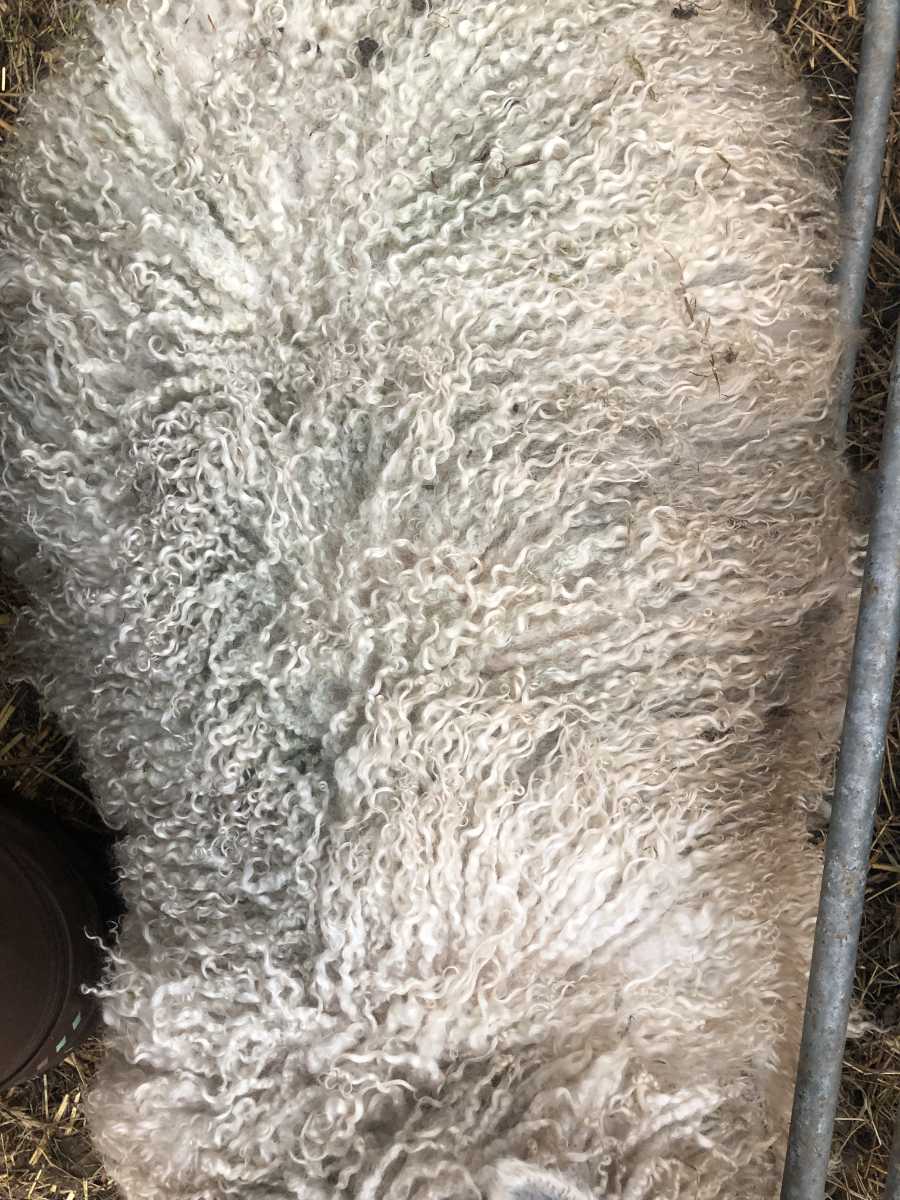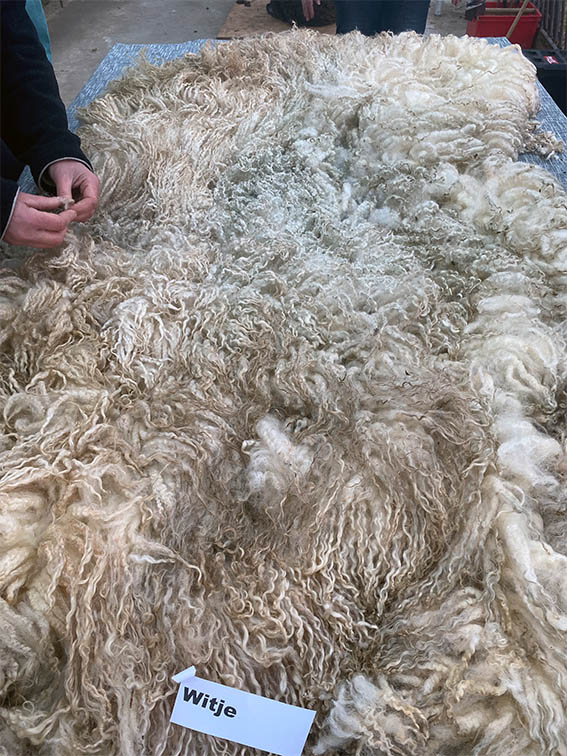 Deze vacht is niet machinaal geschoren maar geknipt. Dat betekent dat er geen “dubbelscheer” in de vacht zit (kleine korte stukjes). Na het scheren zijn evt vuile stukken verwijderd, evenals stro en hooi. De vacht is niet gewassen en is geschoond zoals je hem op de rechter foto’s ziet.